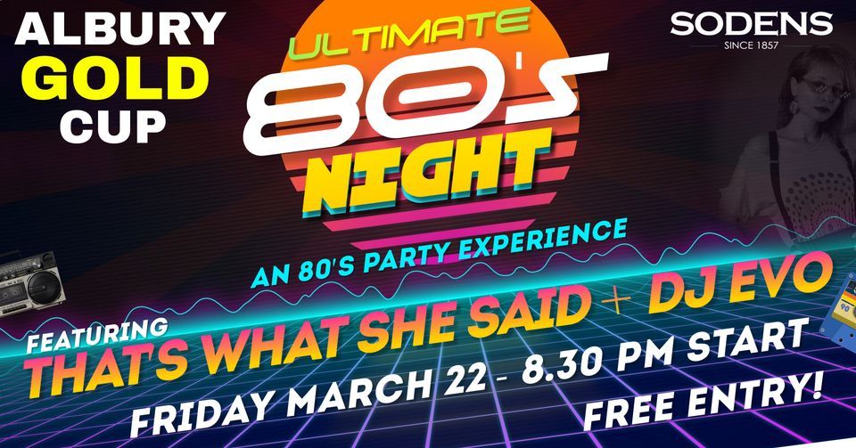 Source : events.humanitix.comULTIMATE 80s NIGHT @ Sodens Gold Cup Day!, Sodens Hotel, Albury